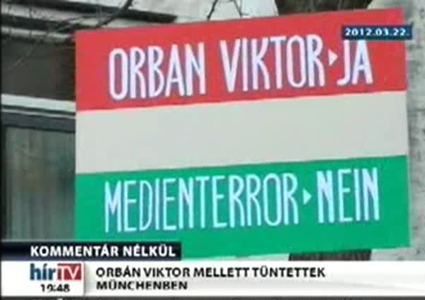 Az Orbán Viktort magyar zászlókkal és például “Viktor for victory”, “Hajrá, Magyarország” és “Viktor, veled vagyunk” feliratú táblákkal fogadó tüntetők – akik Németországban élő magyarok – nevében Czibulás Gábor az MTI-nek a helyszínen azt mondta, azért jöttek, hogy üdvözöljék a kormányfőt, jelenlétüket pedig a táblákon olvasható szövegekkel magyarázta. Hozzátette, a német nyomtatott sajtó “hadjáratot indított Magyarország ellen, különösen Orbán Viktor ellen”, és emiatt is fel akarnak lépni. “Megmutatjuk a német médiumoknak, nem úgy van, ahogy ők állítják” – hangsúlyozta.
