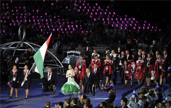 Ezt követte a seregszemlén részt vevő – és rekordot jelentő – 166 nemzet küldöttségének bevonulása, a 33 fős magyar csapat élén az értelmi sérült atléta ikerpár, Biacsi Bernadett és Ilona haladt, akik 1500 m-es síkfutásban lesznek érdekeltek. A piros-fehér-zöld zászlót Bernadett vitte, az előzetes tervekkel ellentétben ugyanis egyszerre nem tudták ketten tartani a rudat. Ami a magyar díszvendégeket illeti, Balog Zoltán, az emberi erőforrások minisztere hétfőtől szerdáig, míg Áder János köztársasági elnök jövő csütörtöktől szombatig látogat majd el a londoni paralimpiára.
