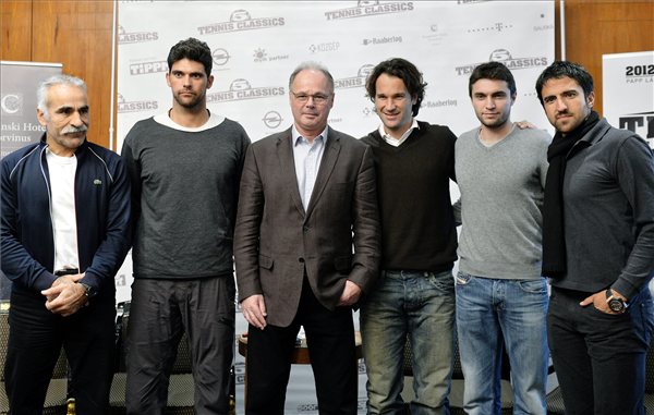 Taróczy Balázs versenyigazgató, egykori teniszbajnok (b3), valamint Mansour Bahrami, Mark Philippoussis, Carlos Moyá, Gilles Simon és Janko Tipsarevic (b-j) teniszezők az ötödik alkalommal megrendezésre kerülő Tennis Classics elnevezésű viadal sajtótájékoztatóján a budapesti Kempinski Hotel Corvinus szállodában 2012. december 3-án. MTI Fotó: Beliczay László