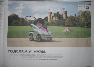 A fél újságoldalt megtöltő hirdetések – amelyeknek színes fotóján az új BMW-modell látható II. Erzsébet királynő windsori rezidenciájának és két kedvenc corgi kutyájának előterében – felhívják a figyelmet arra, hogy az idén esedékes Vilmos herceg, a brit trón majdani várományosa és várandós hitvese, Katalin hercegnő első gyermekének érkezése. A bajor autógyár büszkén tudatja a brit alattvalókkal, hogy ebből az alkalomból BMW P.R.A.M. márkanéven vászontetős, két- vagy négykerék-meghajtású változatban kapható babakocsit hoz forgalomba korlátozott példányszámban a brit piacon.