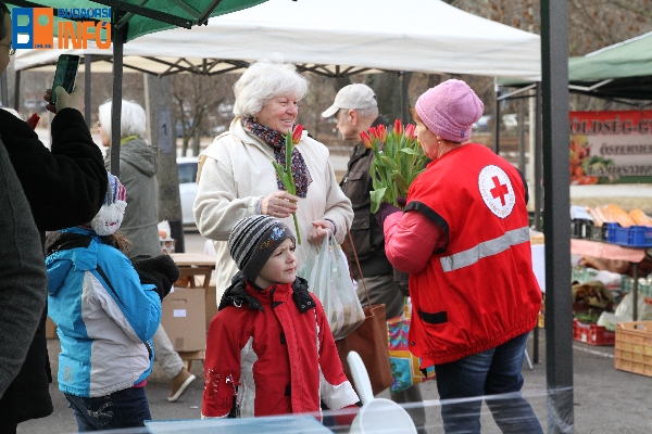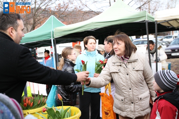 Ezért 300 szál tulipánnal készültek és megajándékozták a szebbik nem képviselőit. A virágok kiosztásában a budaörsi Vöröskereszt önkéntesei segédkeztek.
