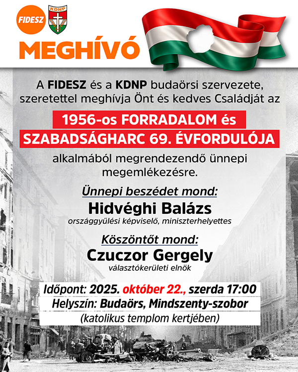 (Budaörs, 2025. október 17. – Budaörsi Infó) A Fidesz és a KDNP budaörsi szervezete az 1956-os forradalom és szabadságharc évfordulója alkalmából ünnepi megemlékezést tart.