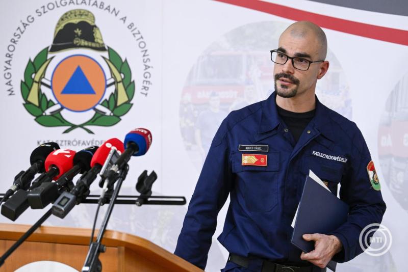Kép: Budapest, 2026. január 14. Mukics Dániel tűzoltó alezredes, az Országos Katasztrófavédelmi Főigazgatóság (OKF) szóvivője a rendkívüli téli időjárás miatt felállított operatív törzs ülését követő sajtótájékoztatón az OKF Mogyoródi úti épületében 2026. január 14-én. MTI/Purger Tamás