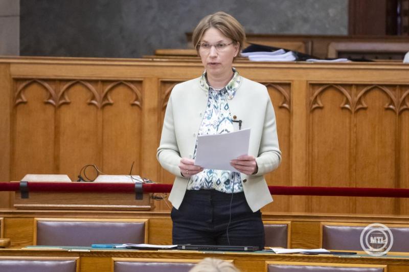 Budapest, 2025. április 29. Hornung Ágnes, a Fidesz vezérszónoka felszólal az egyes családügyi és családtámogatási vonatkozású törvények módosításának vitájában az Országgyűlés plenáris ülésén 2025. április 29-én. MTI/Balogh Zoltán