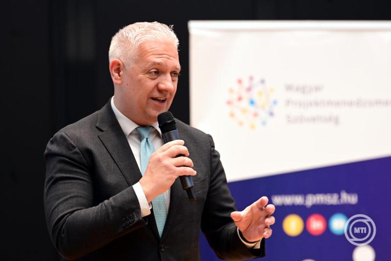 Budapest, 2025. november 20. Szabados Richárd, a Nemzetgazdasági Minisztérium kis- és középvállalkozások fejlesztéséért, technológiáért és védelmi iparért felelős államtitkára beszédet mond az Év Projektmenedzsere Díj átadása alkalmából tartott budapesti ünnepségen 2025. november 20-án. MTI/Kovács Attila