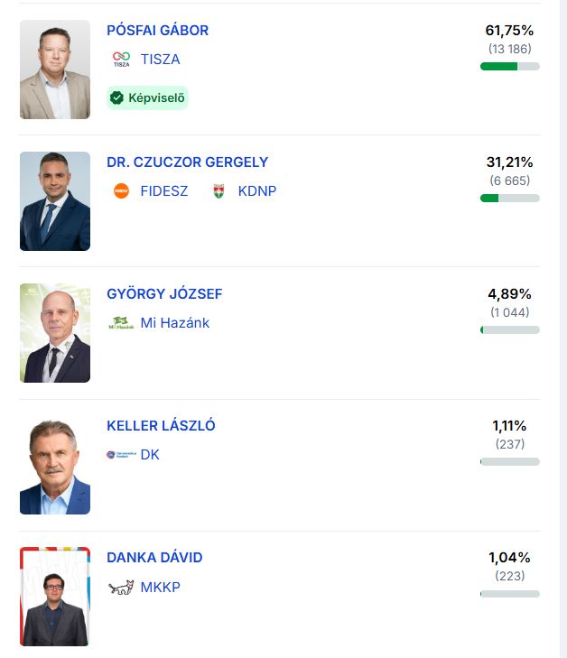 A választókerületben 98,86 százalékos feldolgozottságnál Pósfai Gábor, a Tisza jelöltje vezet 62,05 százalékkal, 39 142 szavazattal. Dr. Czuczor Gergely, a Fidesz–KDNP jelöltje 30,73 százalékot és 19 385 voksot kapott. György József, a Mi Hazánk jelöltje 5,09 százalékon, Keller László, a DK jelöltje 1,13 százalékon, Danka Dávid, az MKKP jelöltje pedig 1,00 százalékon állt. A térségben tehát egyértelmű Tisza-fölény rajzolódott ki.