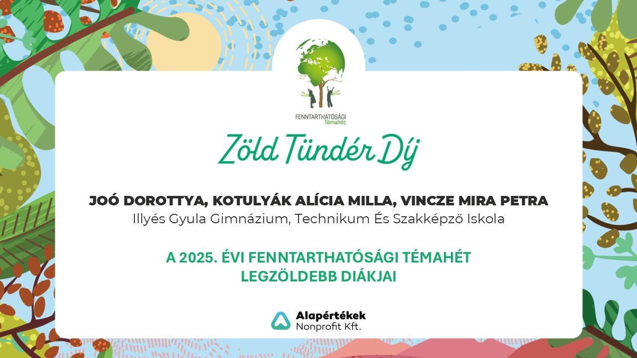 A programsorozat kiemelt pillanata volt a Zöld Tündér Díjak átadása, amellyel a 2025-ös Fenntarthatósági Témahét legaktívabb résztvevőit ismerték el. Az idei díjazottak között budaörsi diákok is szerepelnek: az Illyés Gyula Gimnázium, Technikum és Szakképző Iskola tanulói, Joó Dorottya, Kotulyák Alícia Milla és Vincze Mira Petra kapták meg a „legzöldebb diákoknak” járó elismerést.